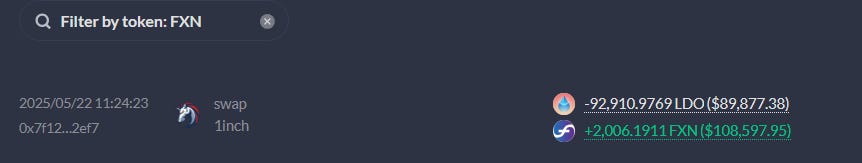 The 2nd in the list “TOP 100 LDO Leaderboard” has a PF of 1m$. He swapped LDO → FXN on May 22, buying 2k FXN, and already in profit by 66%. This guys is also a large holder of PENDLE & CRV, and is using FX Protocol with 70k$ deposit.