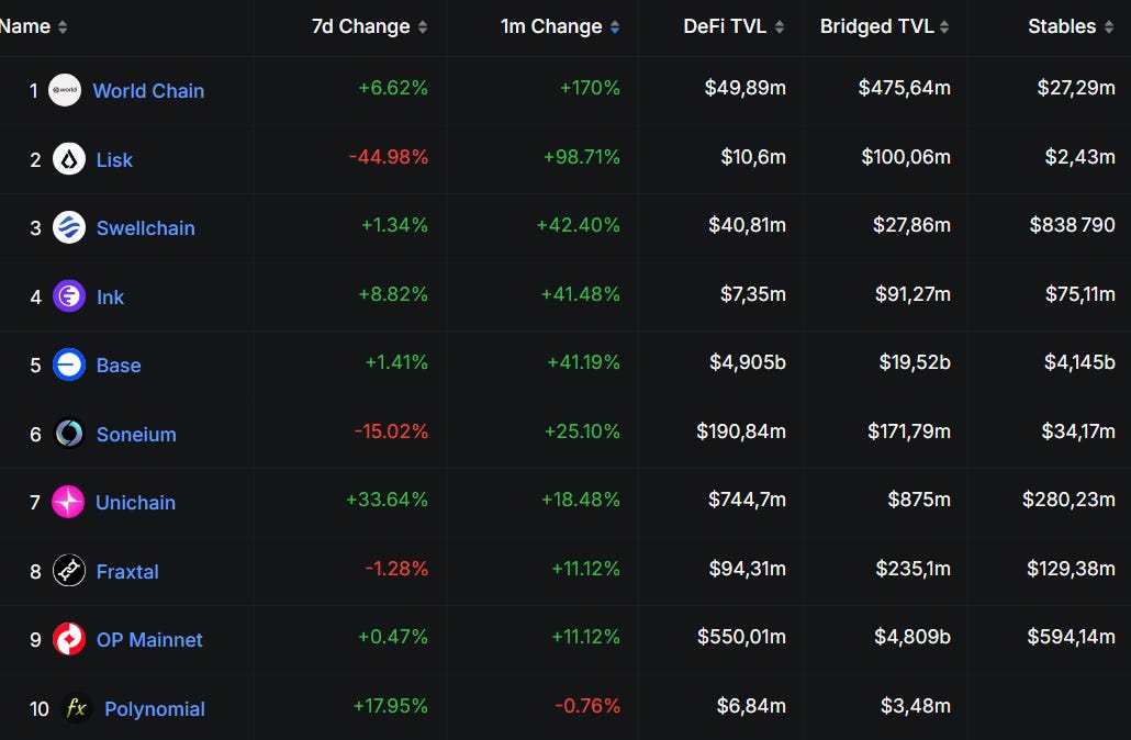 World is really oing great, mainly driven by Morpho growth. Soneium saw a slight decrease of TVL after the end of the ACS incentives campaign. But TVL seems to stick for the time being.